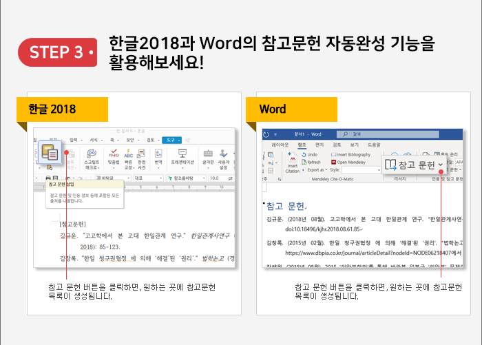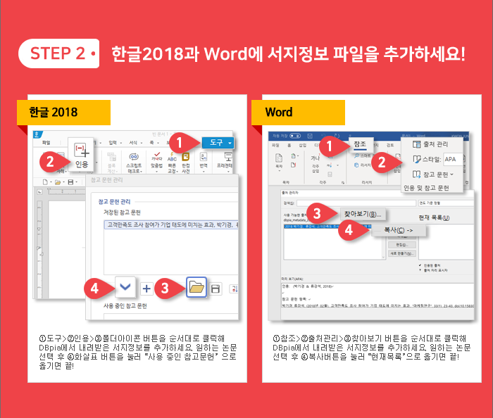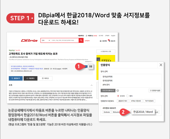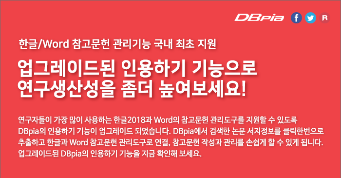 DBPIA에서 참고문헌을 워드와 한글로 바로 보낼 수 있도록 기능이 업그레이드 되었습니다. 워드와 한글에 각각 사용방법을 스텝별로 안내하고 있으니 참고하세요! DBPIA는 2019년 현재 DGIST 구독 자원입니다.